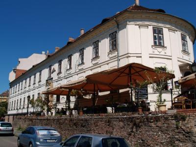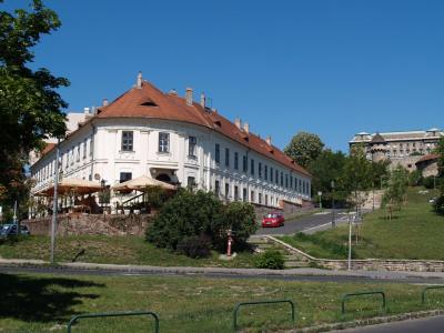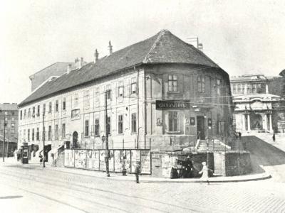 A Várhegy és a Tabán találkozásánál lévő copf-rokokó sarokház helyén már – írásos dokumentum szerint – 1705-ben létezett egy Aranyszarvashoz címzett kocsma. Ez azonban 1810-ben, a nagy tabáni tűzvész alkalmával leégett, 1811-ben építették újjá a jelenlegi formájában, Sághy Ferenc, az Egyetemi Nyomda gondnoka számára, aki itt kávéházat nyitott. A kávéház az írók és költők kedvelt találkozóhelyévé vált. ----- 1894-ben az Attila út szintjét lesüllyesztették, az épület így szabaddá váló pincefalait – a sarokrész kivételével, ahol a régi járdaszintet teraszszerűen meghagyták – támpillérekkel erősítették meg. Ugyanakkor eredeti kapuját befalazták, a bejáratot lejjebb helyezték, kapualjába lépcsők kerültek, mindezekkel az épületet egykori architektúrájától megfosztották.