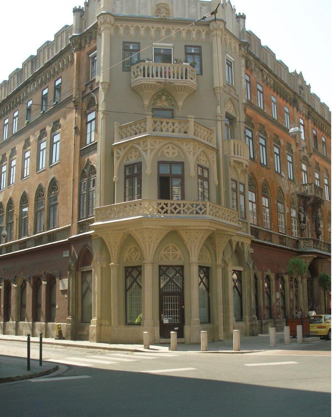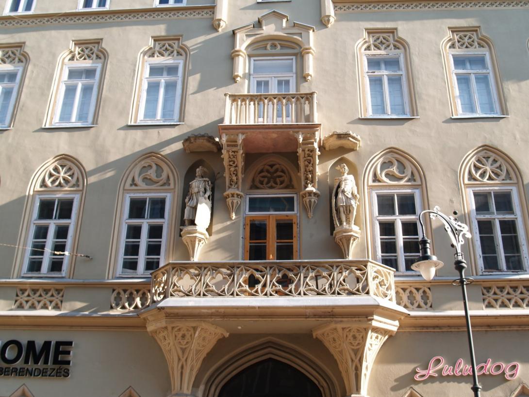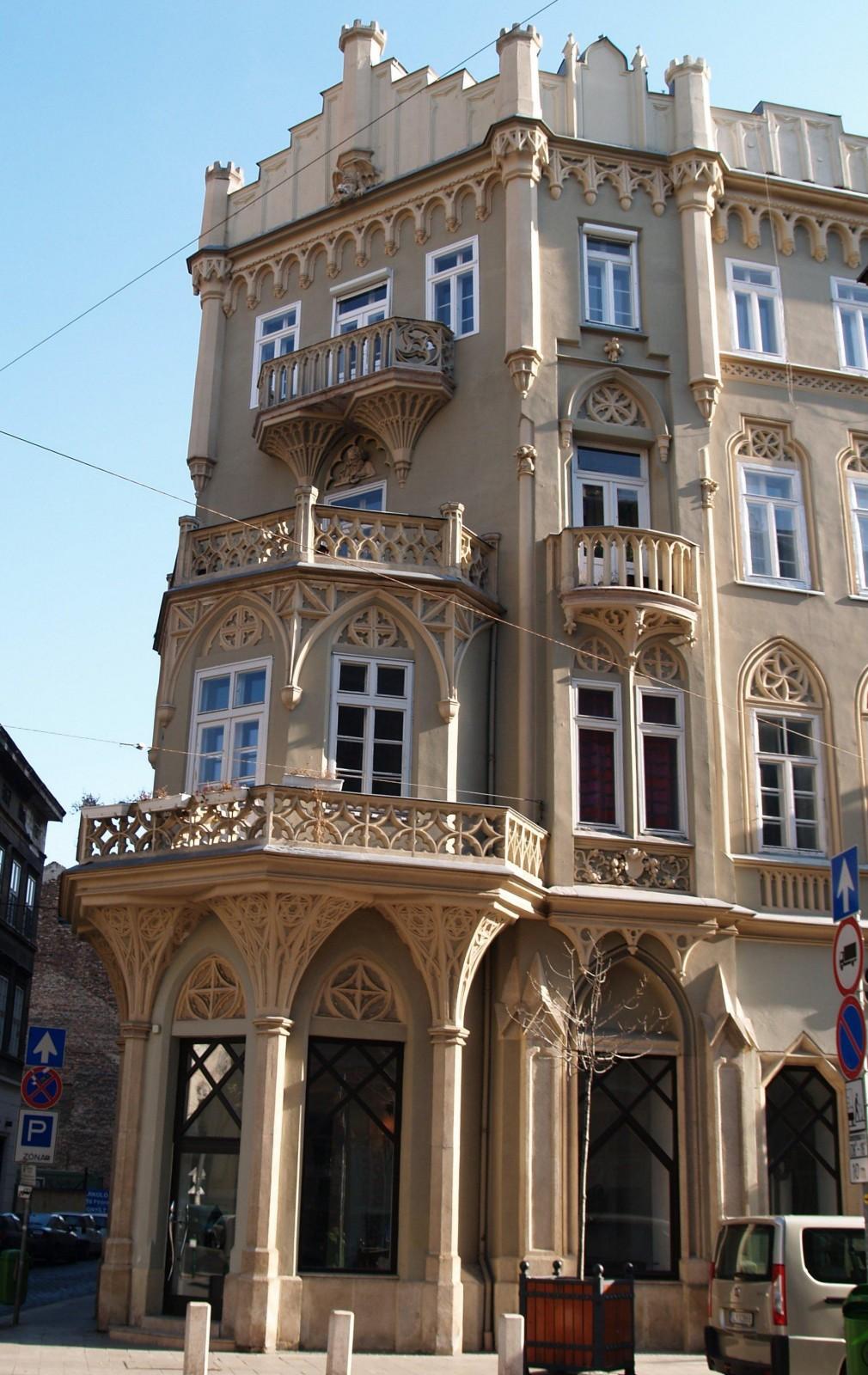A Király utca 47. – Kis diófa (most Csányi) utca 12-14. saroképület: Pekáry-ház, 1847-48-ban épült, Brein Ferenc tervei szerint, Pekáry Imre volt városi alkapitány számára. (A lépcsőkorlátok GP betűs díszítése Generális Pekáry-ra utal. ------ Brein Ferenc tervezte a kőbányai csősztornyot is.)  A romantika stílusára jellemzően gótikus elemekkel gazdagon díszített homlokzatokkal, amelyek hangsúlya a levágott sarokra került. Három emeletével és stílusával építése idején  messze kitűnt  földszintes vagy egy-két emeletes, klasszicista  környezetéből. -----  Találgatásokra ad okot a kapu feletti díszítések ellentmondásossága: egyrészt az erkélytartó konzolokon lévő Dávid-csillagok, másrészt a falfülkékben álló magyar vitéz szobrok. Az elsőt talán a régi zsidónegyed-beli környezet, az utóbbit a megrendelő személye indokolta.