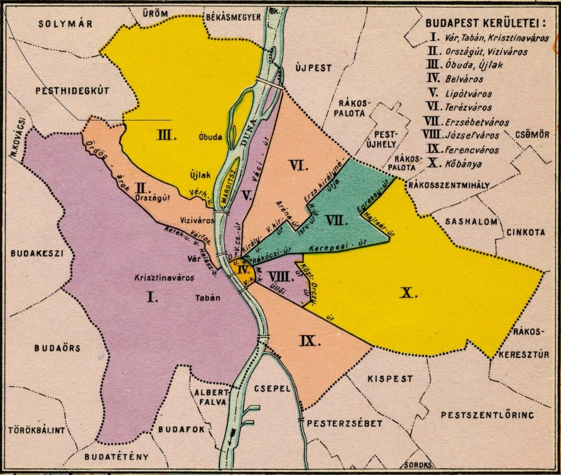 A városegyesítéssel 1873-ban létrehozott Budapesten 10 kerületet alakítottak ki, a budai oldalon hármat, a pestin hetet.